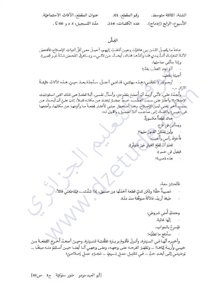 تحضير نص الغش – أبو العيد دودو السنة الثالثة متوسط – الجيل الثاني