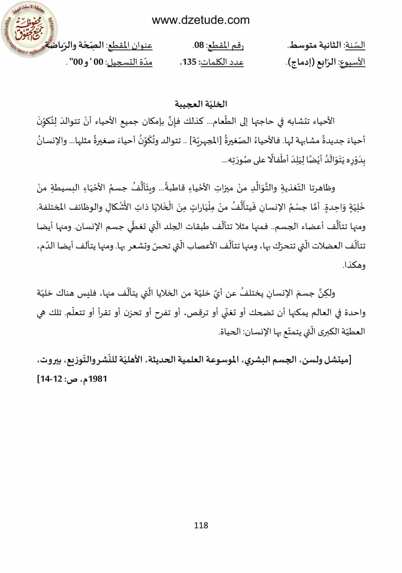 نص فهم المنطوق الخلية العجيبة السنة الثانية متوسط – الجيل الثاني